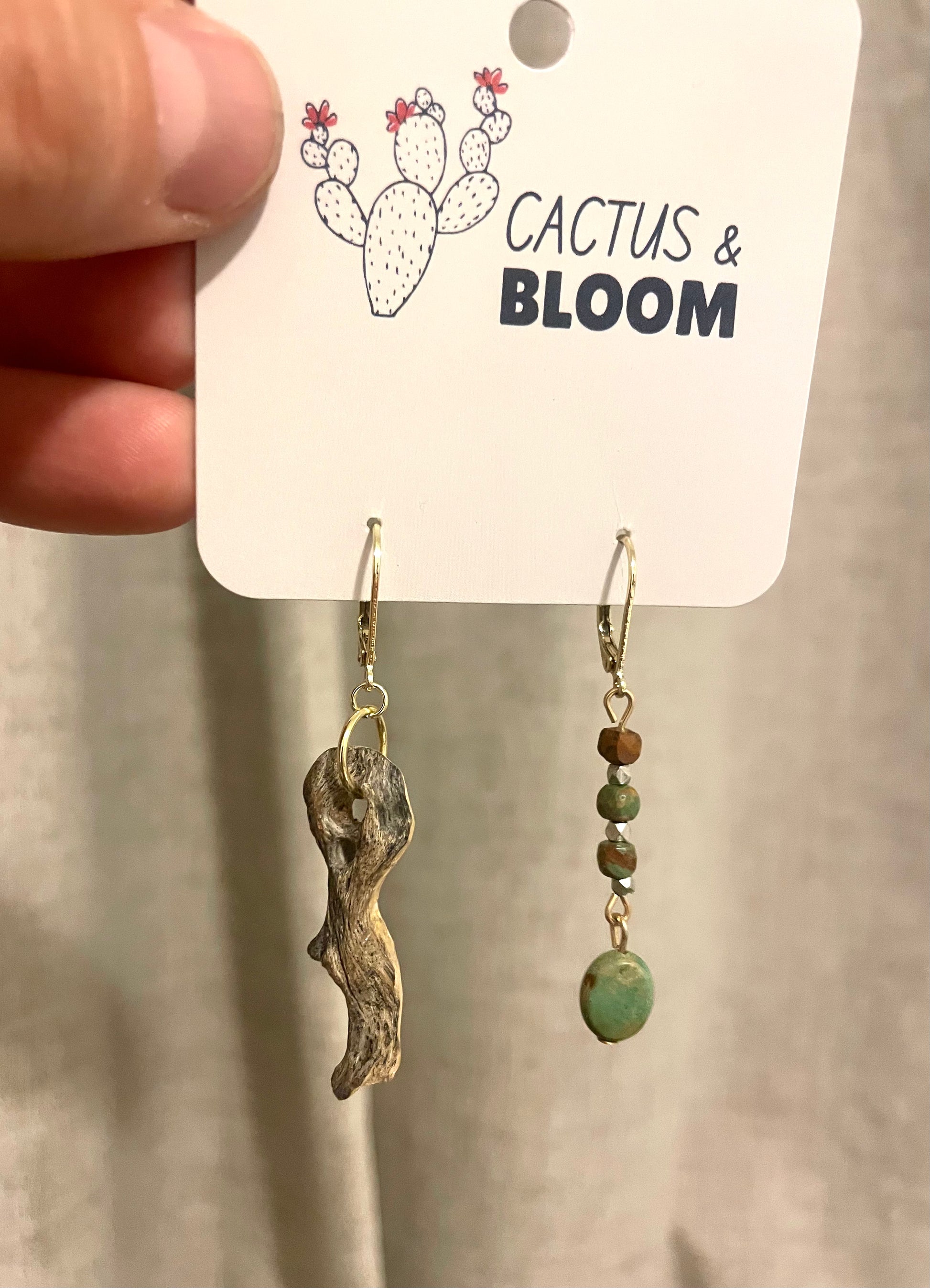 Asymmetrical Key Shaped Cholla Cactus Wood and Turquoise Earrings